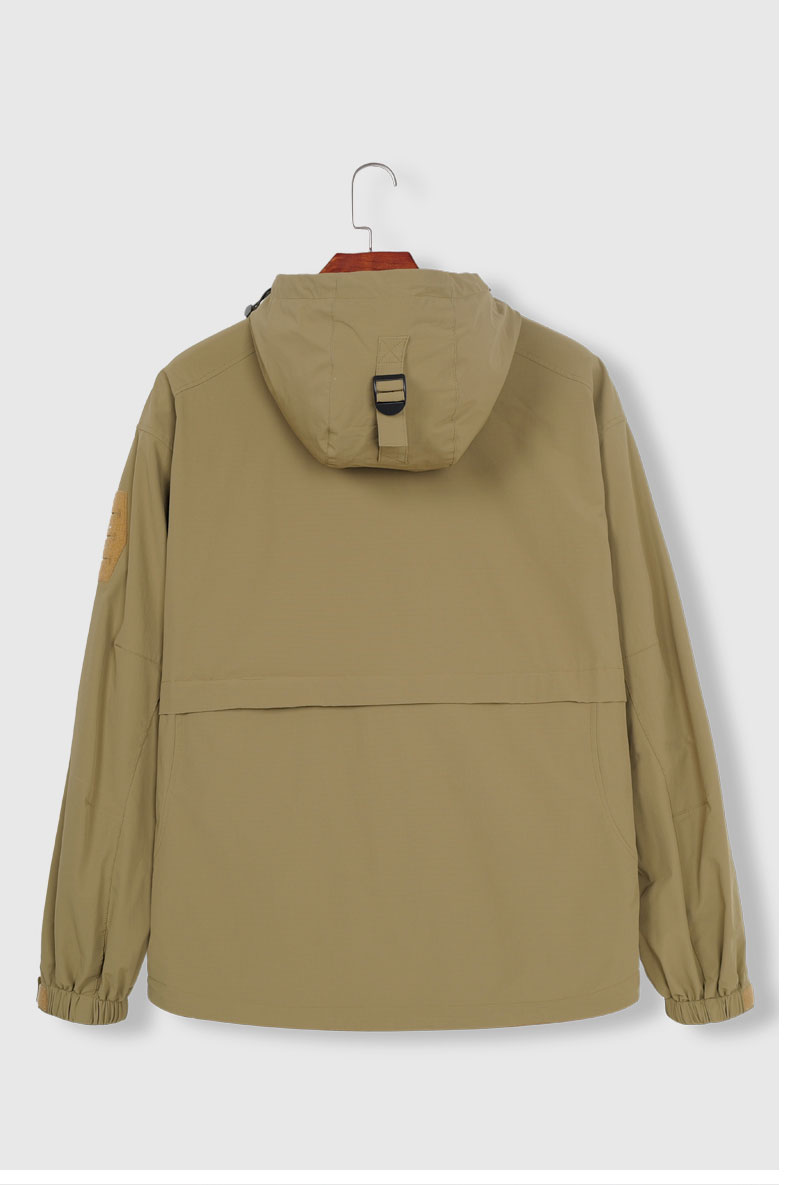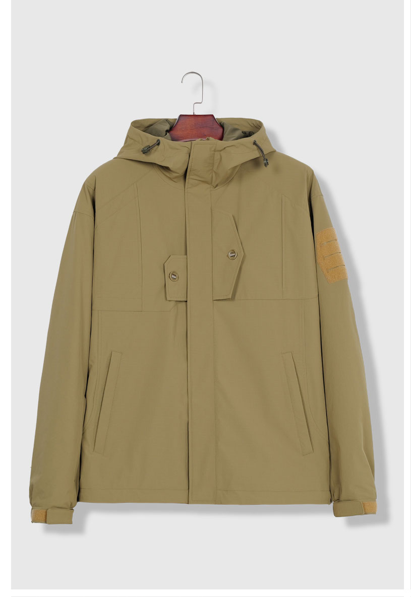 A high-fashion hooded jacket designed for men, featuring a weather-resistant shell, distinctive flap chest pockets, and the convenience of a fully packable design.