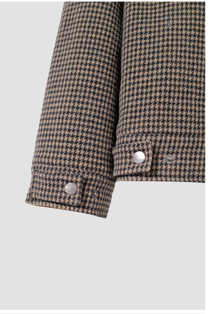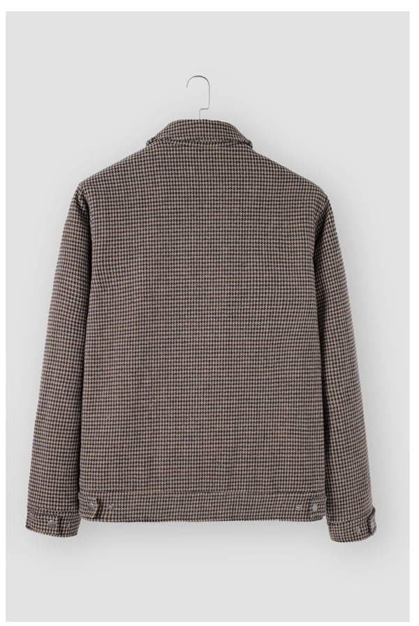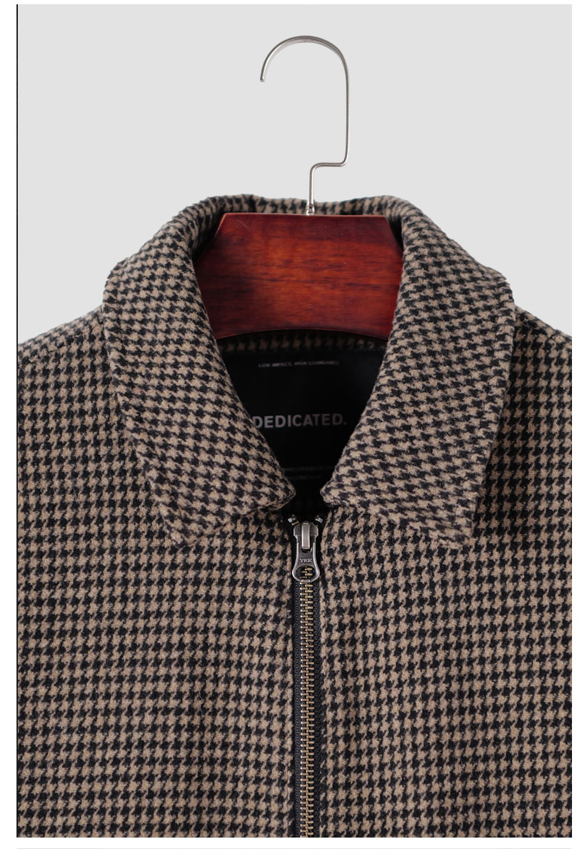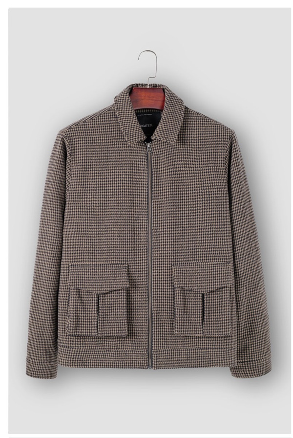 A men’s recycled wool jacket with a classic dogtooth check design, crafted to elevate outerwear collections. When your autumn launch demands something special to highlight your brand’s signature flair, this is the premium piece that stands out.