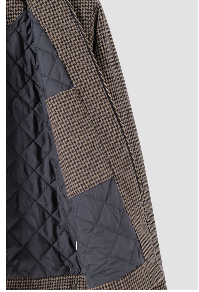 This men’s recycled wool jacket brings together heritage-inspired style and modern garment production. The shell is woven in a dogtooth check pattern, blending 50% recycled wool with recycled polyester for durability and sustainable luxury. Inside, a diamond-quilted body with recycled polyester fill offers lightweight insulation, making this jacket ideal for transitional mid-season wear.